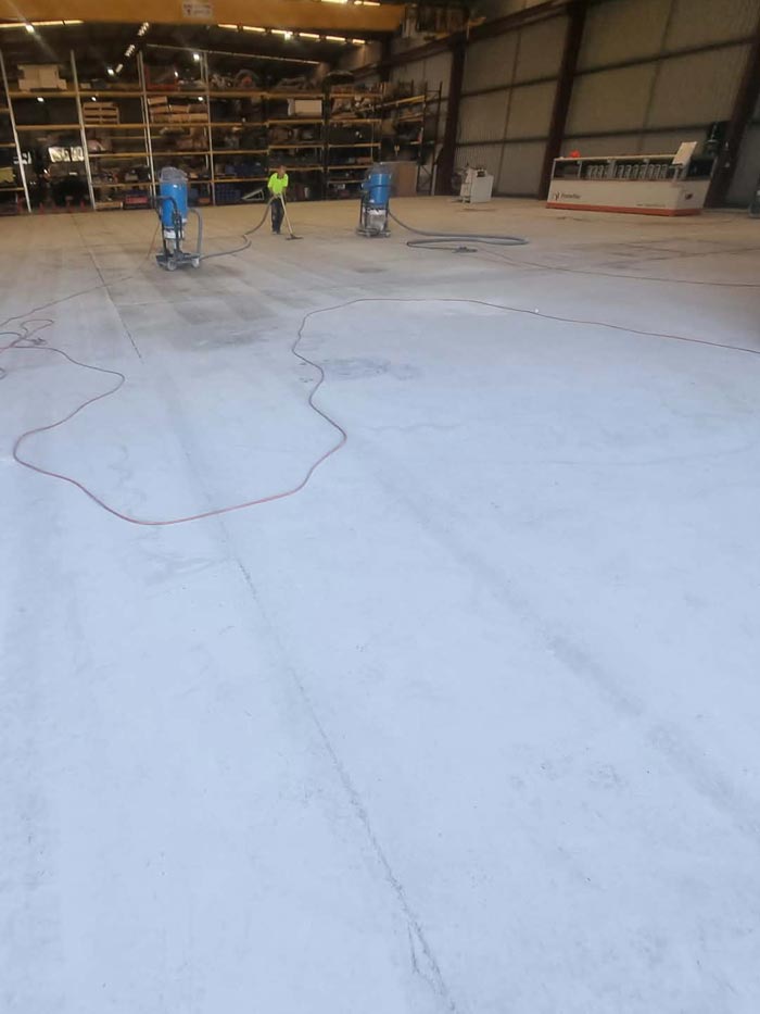 Concrete surfaces are mechanically ground and prepared to create the correct bonding profile for industrial floor coatings.
