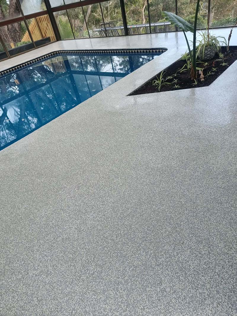 Slip-resistant surface treatments are applied where traction and safety are required around pool environments.
